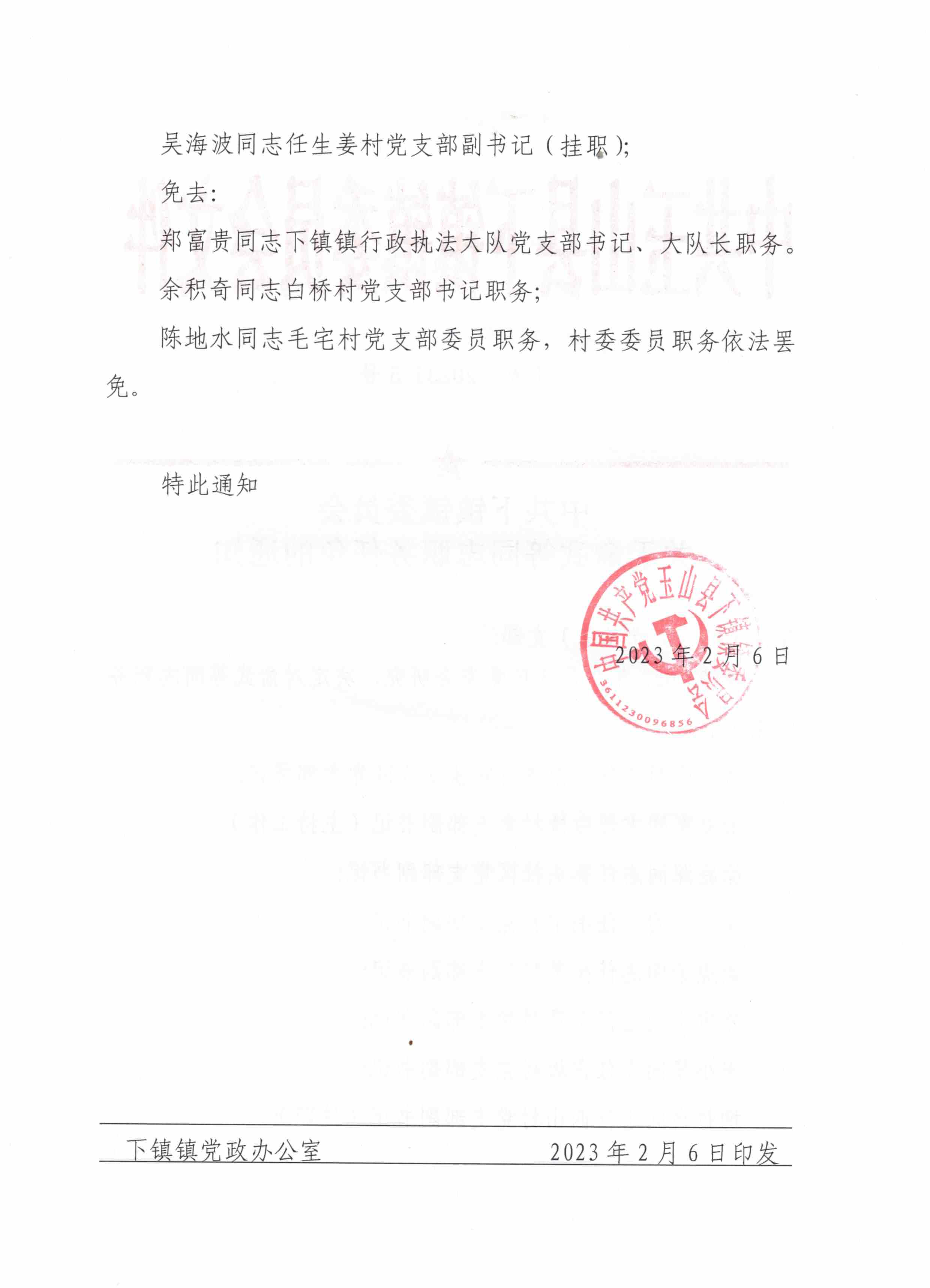中共下鎮鎮委員會關于俞武等同志職務任免的通知