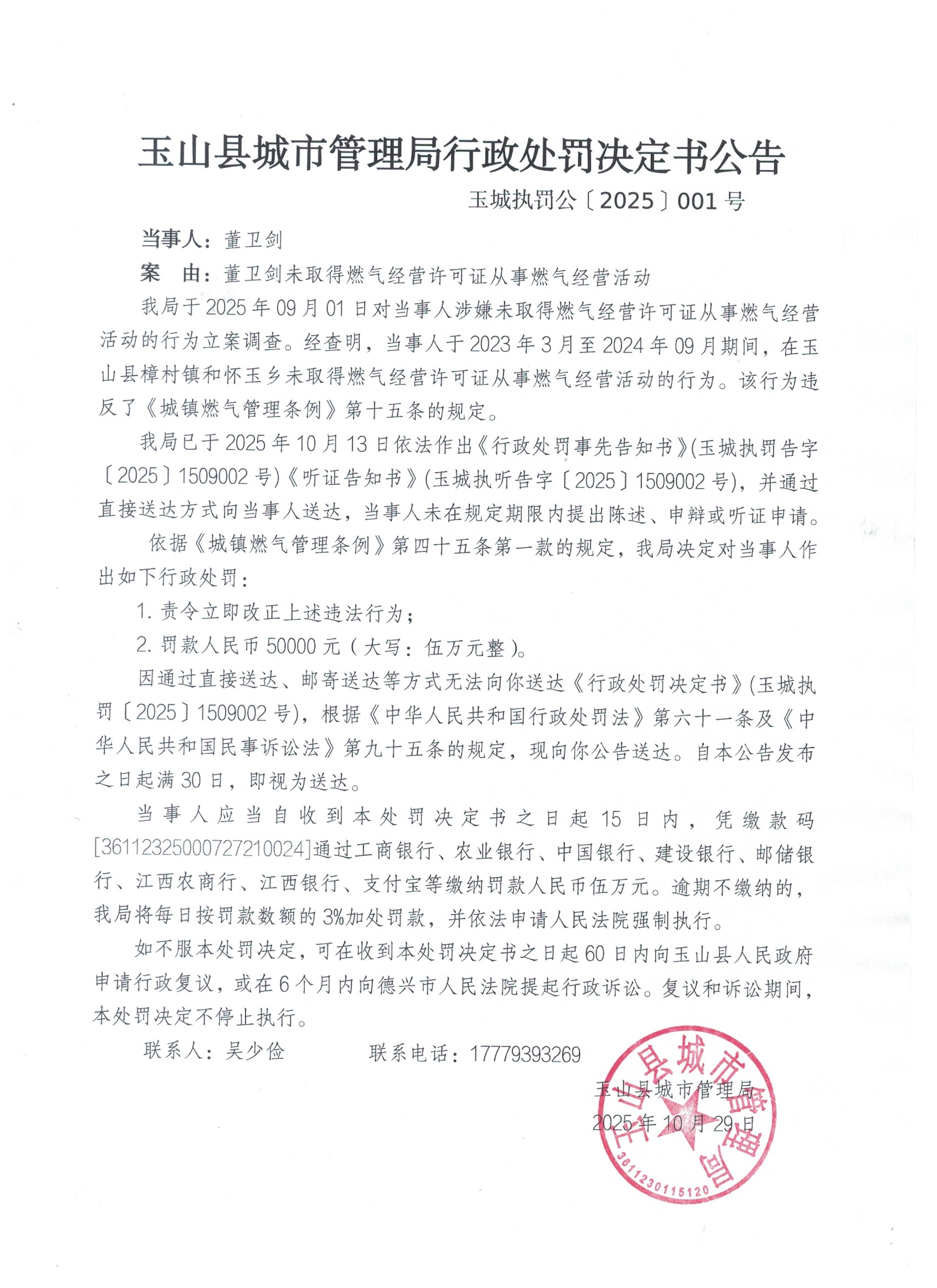 玉山縣城市管理局行政處罰決定書公告