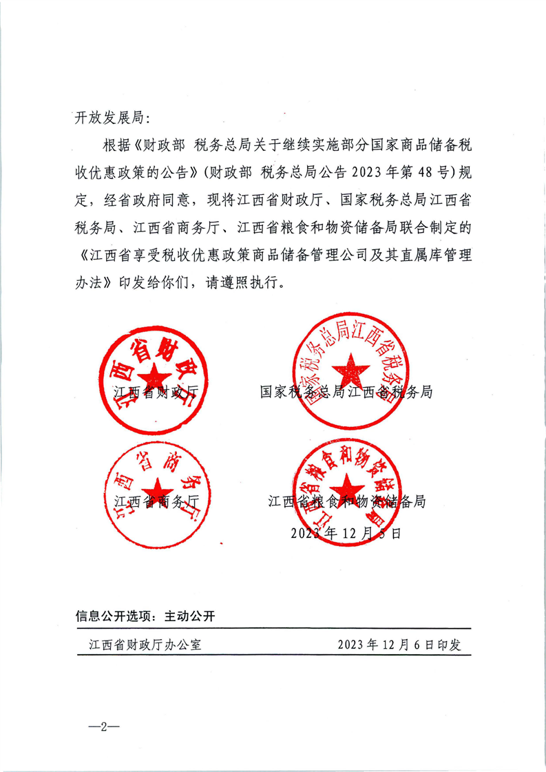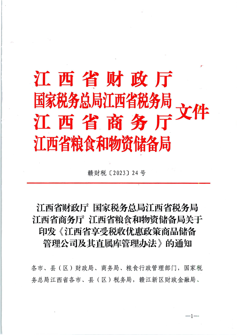 江西省財政廳 國家稅務總局江西省稅務局 江西省商務廳 江西省糧食和物資儲備局關于印發《江西省享受稅收優惠政策商品儲備管理公司及其直屬庫管理辦法》的通知
