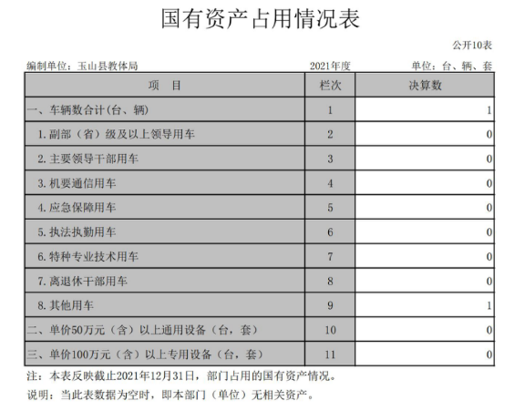 截止2021年12月31日,本單位國有資產(chǎn)占用情況見公開10表《國有資產(chǎn)占用情況表》。其中車輛中的其他用車是玉山中等專業(yè)學(xué)校招生用車1輛。