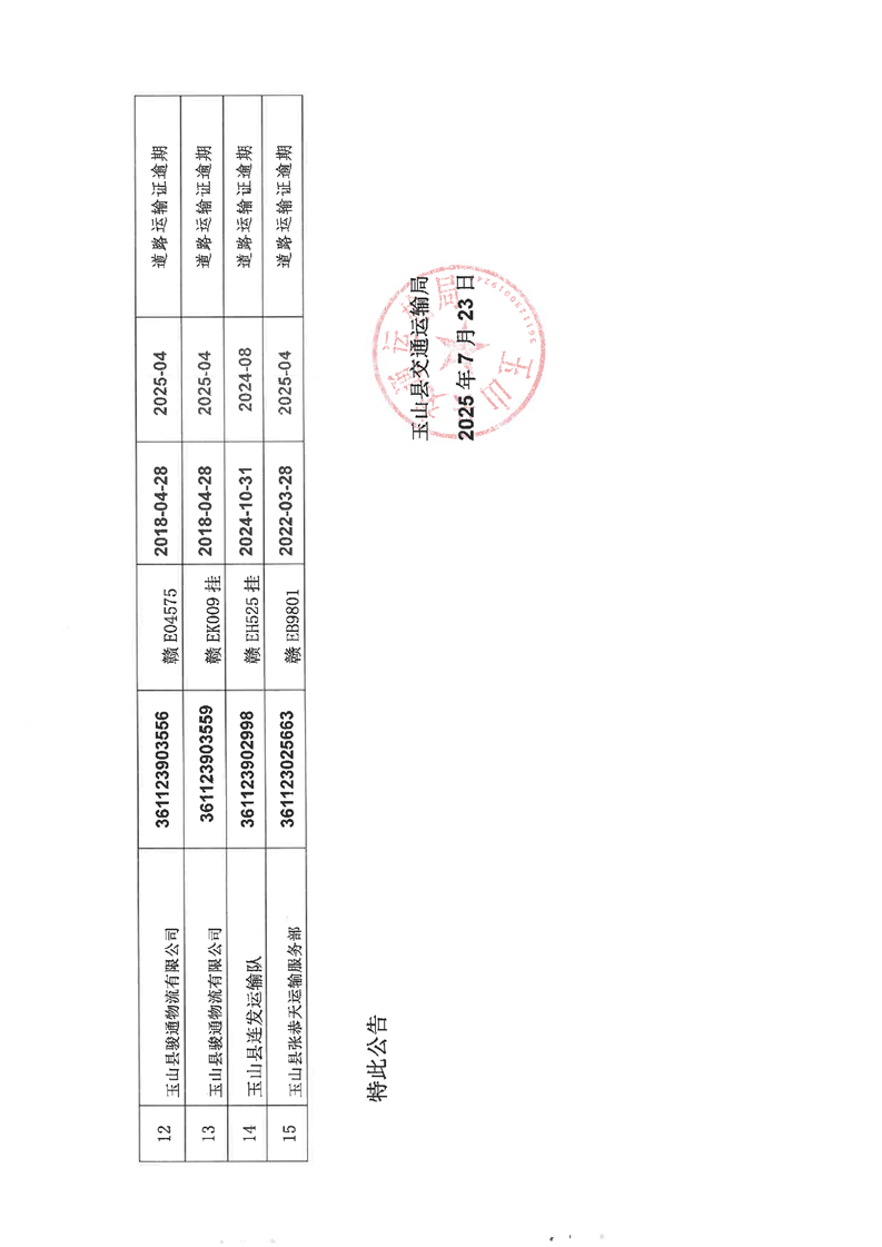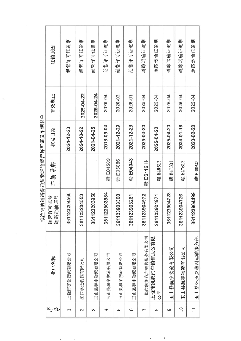 玉山縣交通運輸局關于對道路普通貨物運輸《道路運輸經營許可證》及車輛《道路運輸證》擬予以注銷的公告2025年度(第三批)