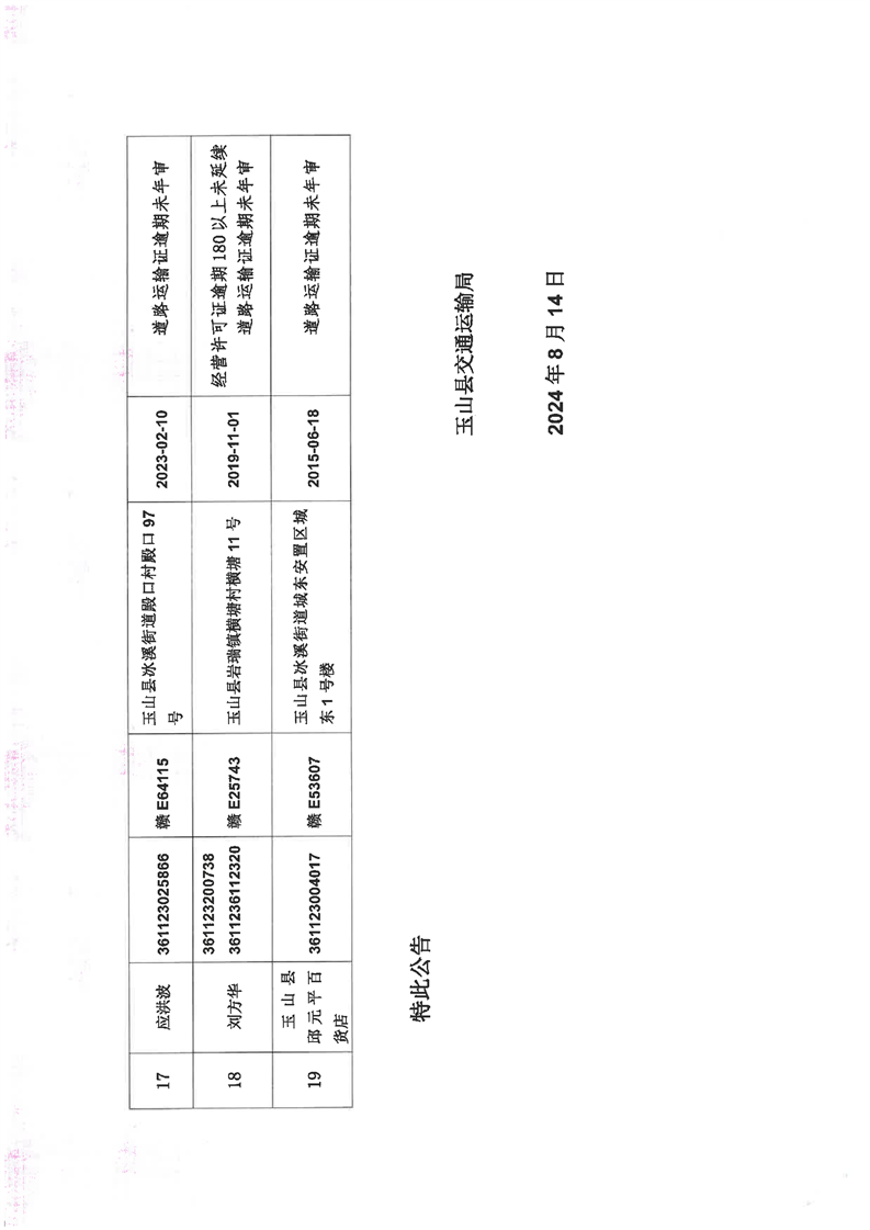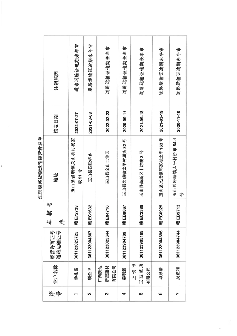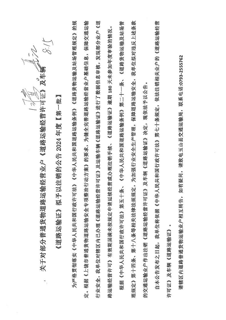 關于對部分普通貨物道路運輸經營業戶《道路運輸經營許可證》及車輛《道路運輸證》擬予以注銷的公告2024年度【第一批】(1)