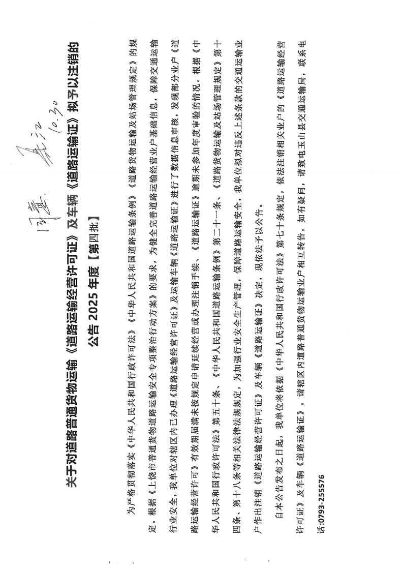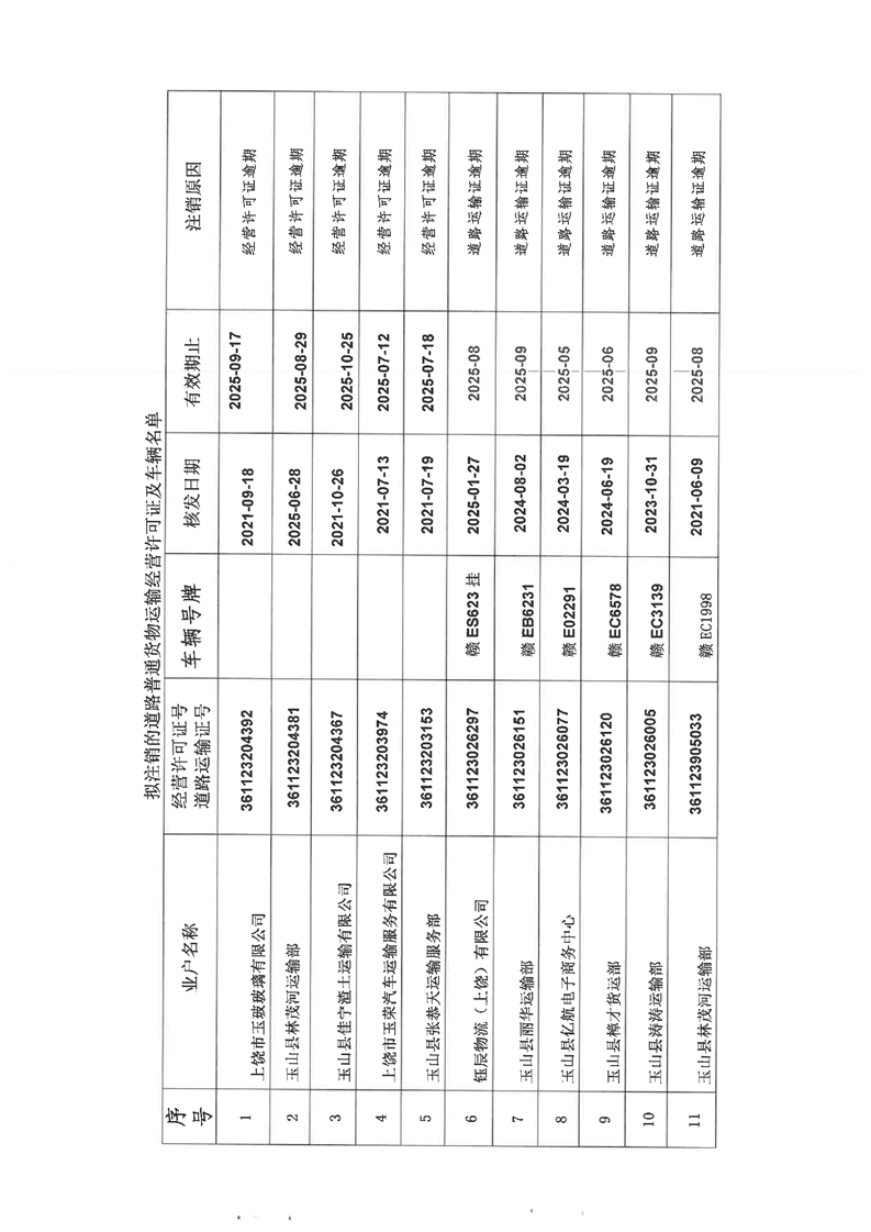 關于對道路普通貨物運輸《道路運輸經營許可證》及車輛《道路運輸證》擬予以注銷的公告2025年度【第四批】