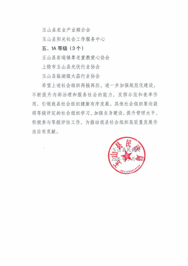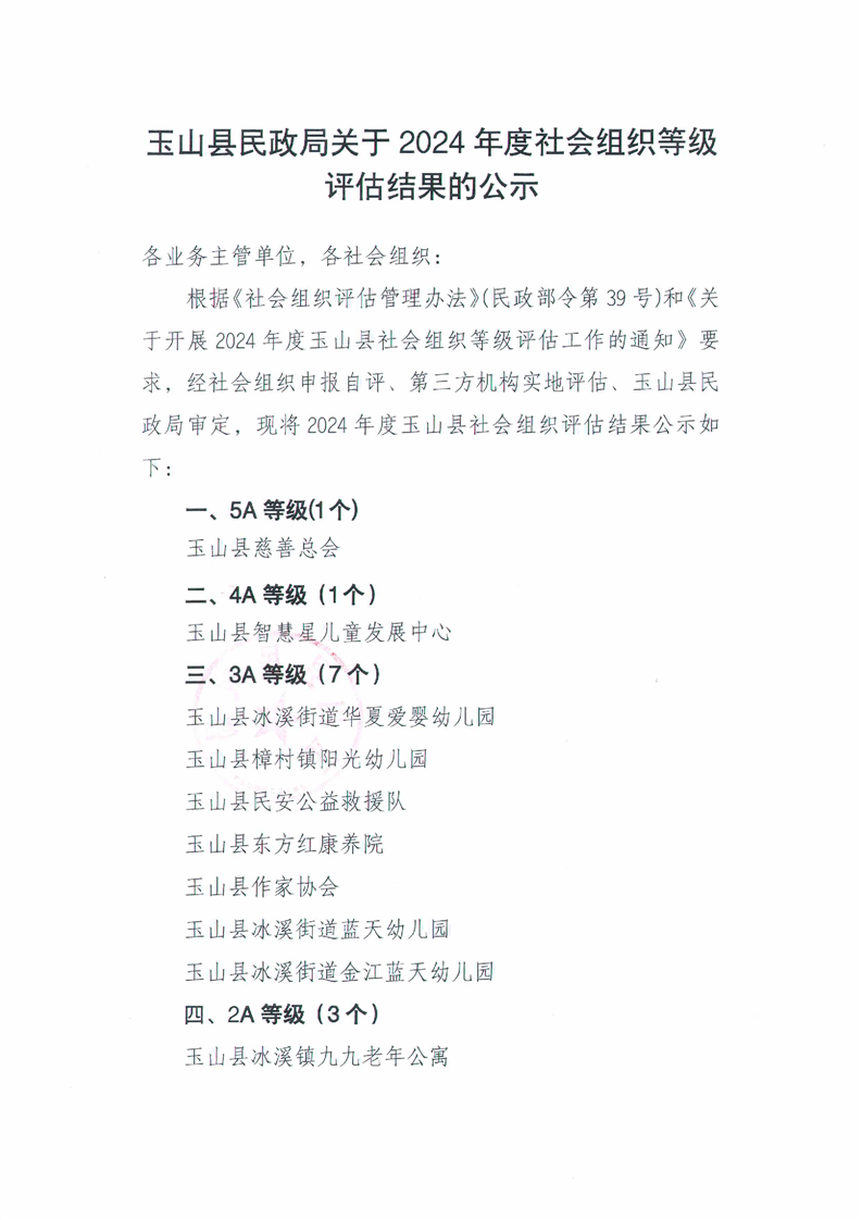 玉山縣民政局關于2024年度社會組織等級評估結果的公示