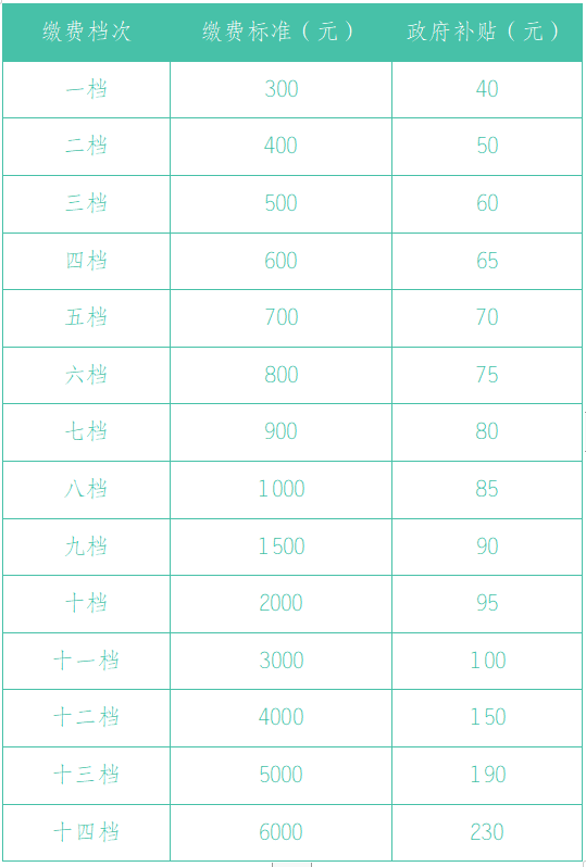 四、城鄉(xiāng)居民養(yǎng)老保險(xiǎn)有哪些繳費(fèi)檔次?有沒有什么優(yōu)惠政策?答:從2022年6月1日起,將城鄉(xiāng)居民基本養(yǎng)老保險(xiǎn)繳費(fèi)檔次調(diào)整為每年300元、400元、500元、600元、700元、800元、900元、1000元、1500元、2000元、3000元、4000元、5000元、6000元等14個(gè)檔次,參保人可自主選擇檔次繳費(fèi),繳費(fèi)補(bǔ)貼與個(gè)人繳費(fèi)一并計(jì)入個(gè)人賬戶,跨年度補(bǔ)繳不享受政府補(bǔ)貼(對(duì)應(yīng)下圖),多繳多得。
