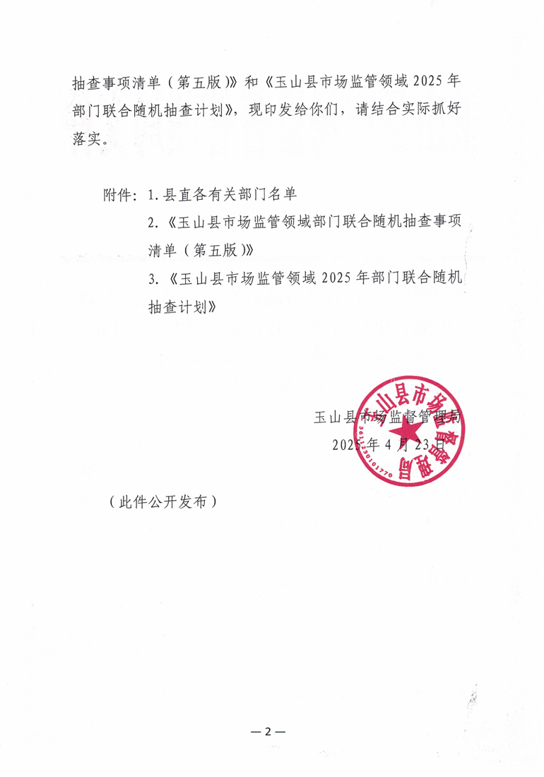 關(guān)于印發(fā)《2025年玉山縣市場監(jiān)督管理局隨機抽查事項清單》和《玉山縣市場監(jiān)督管理局2025年度“雙隨機、一公開”抽查工作計劃》的通知