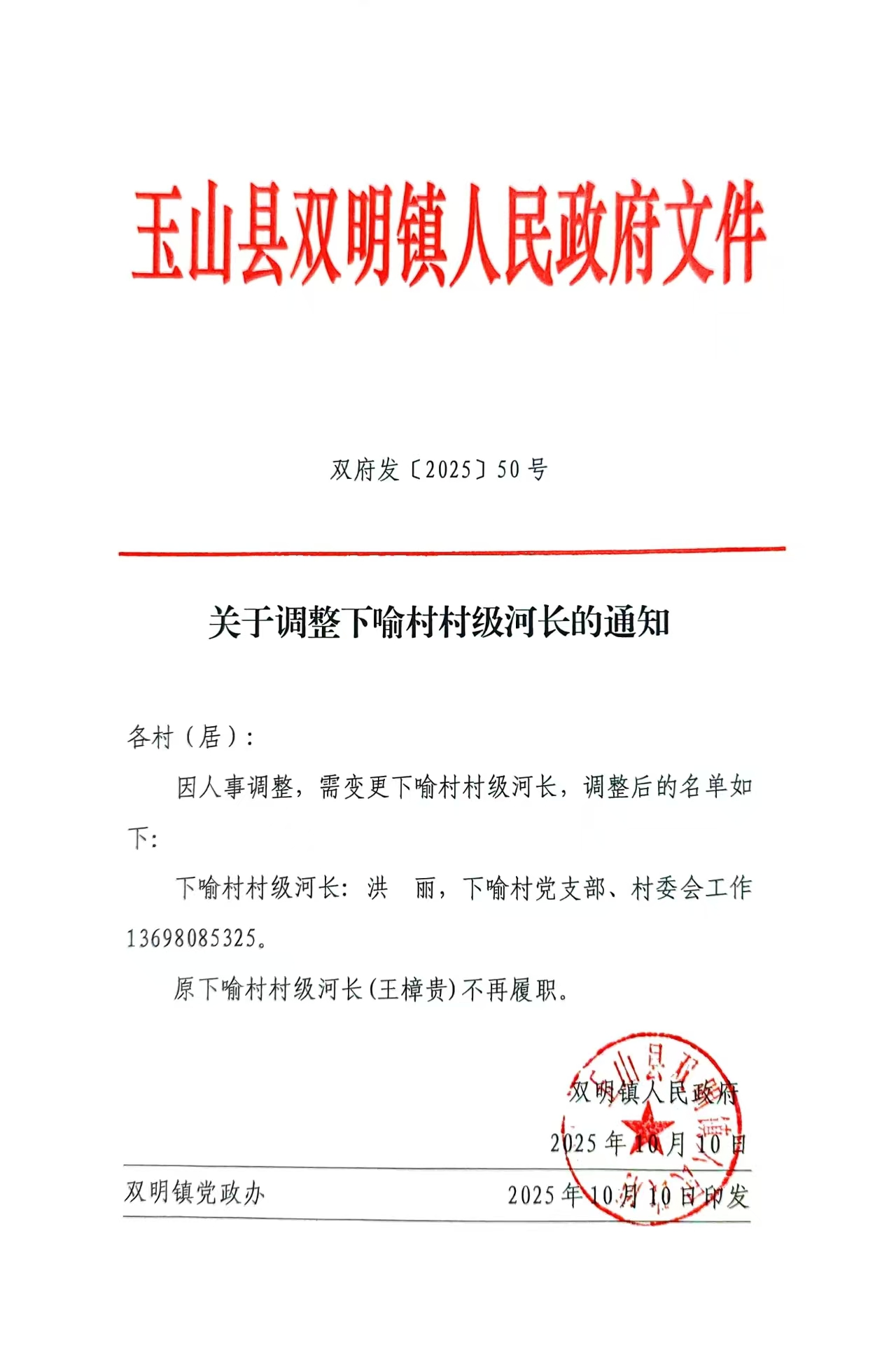 關(guān)于調(diào)整下喻村村級(jí)河長(zhǎng)的通知