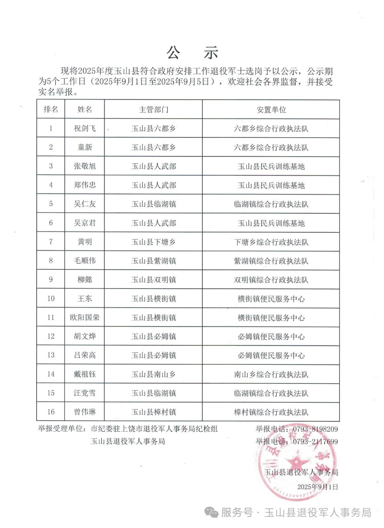 玉山縣2025年符合政府安排工作轉業軍士選崗結果公示