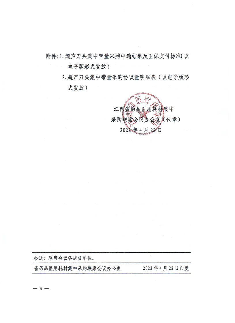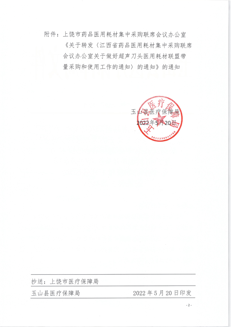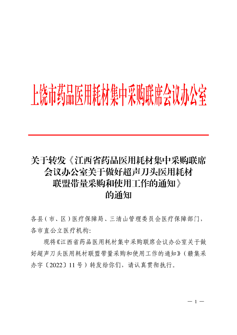 關于轉發上饒市藥品醫用耗材集中采購聯席會議辦公室《關于轉發<江西省藥品醫用耗材集中采購會議辦公室關于做好超聲刀頭醫用耗材聯盟帶量采購和使用工作的通知>的通知》的通知