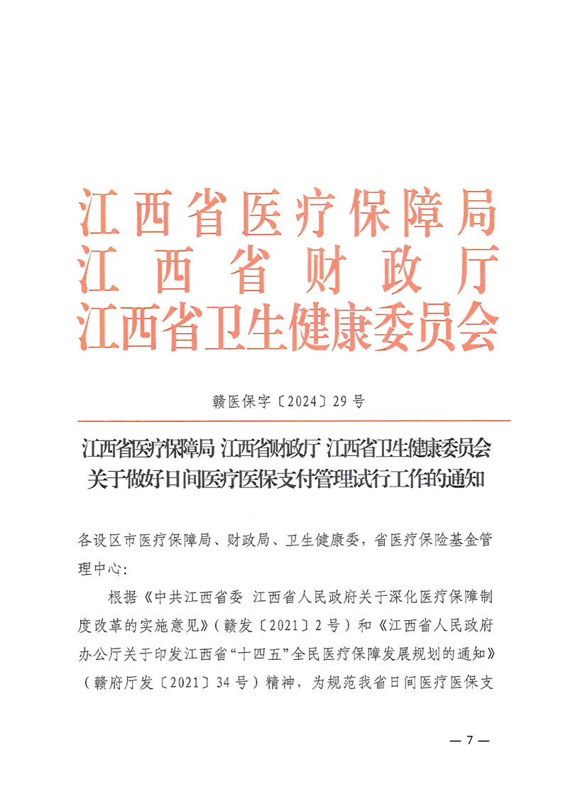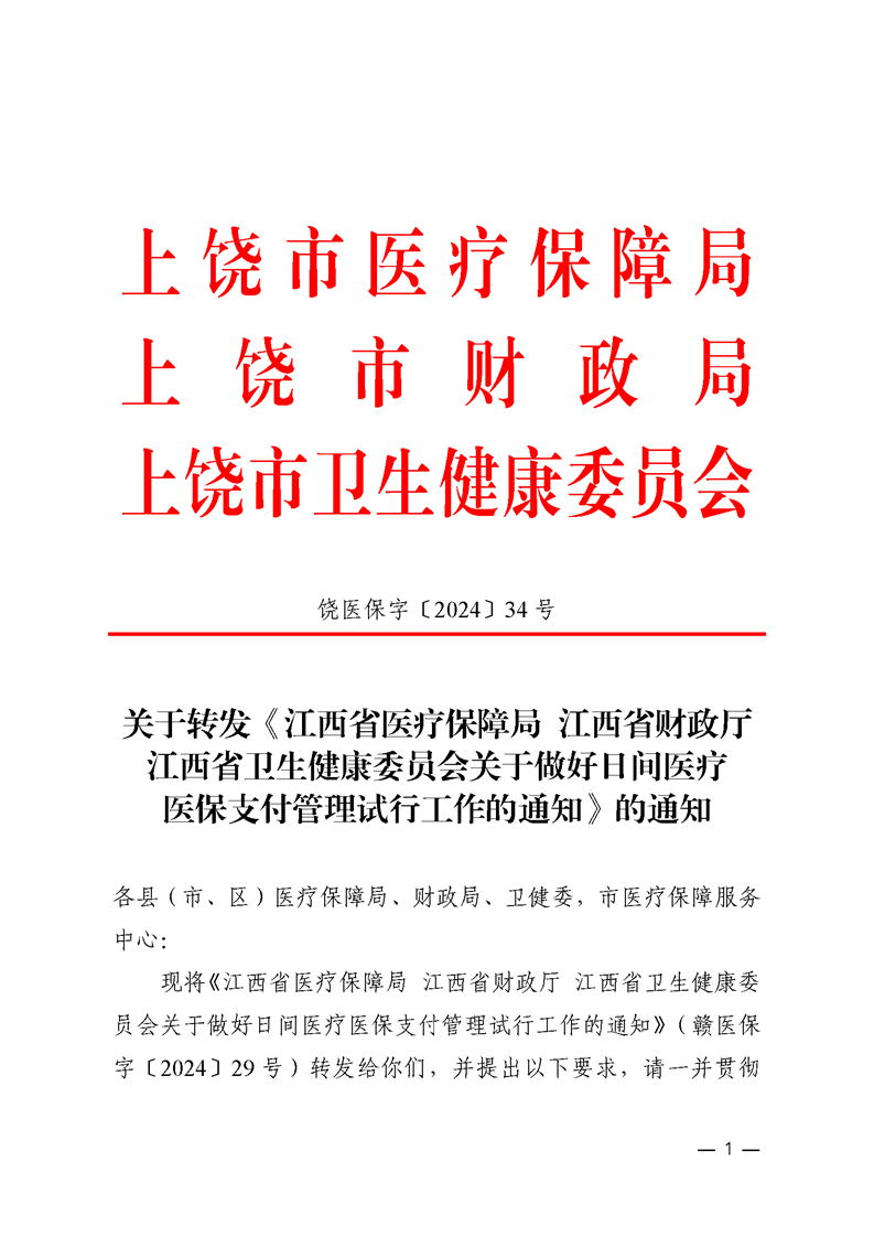 饒醫保字[2024]34號關于轉發《江西省醫療保障局 江西省財政廳 江西省衛生健康委員會關于做好日間醫療醫保支付管理試行工作的通知》的通知