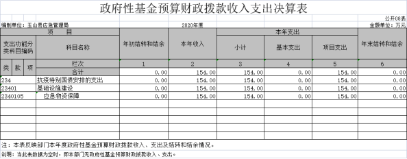 (四)抗疫特別國債安排的支出年初預(yù)算數(shù)為0萬元,決算數(shù)為154萬元,完成年初預(yù)算數(shù)的154%。主要原因是:本年因為疫情原因,特別安排支出。