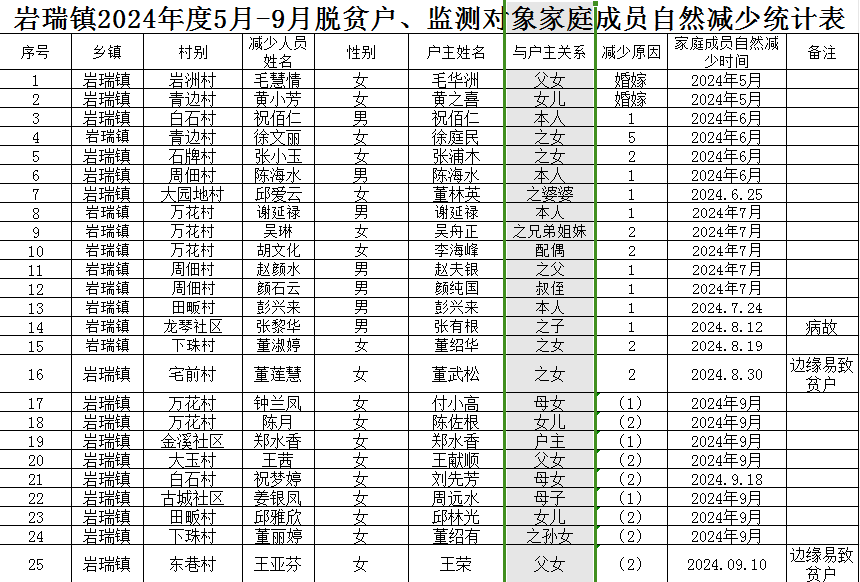 巖瑞鎮(zhèn)2024年度5-9月脫貧戶家庭成員自然減少統(tǒng)計(jì)表