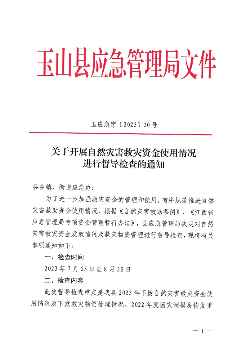 玉應(yīng)急字〔2023〕30號關(guān)于開展自然災(zāi)害救災(zāi)資金使用情況進(jìn)行督導(dǎo)檢查的通知