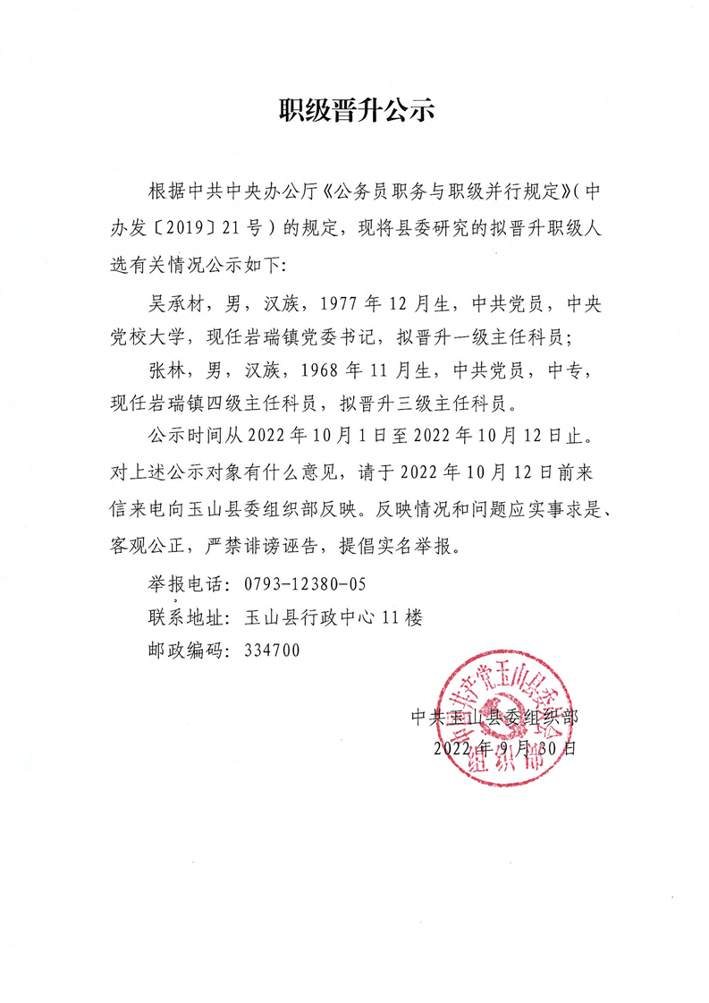 關于吳承材、張林同志的職級晉升公示