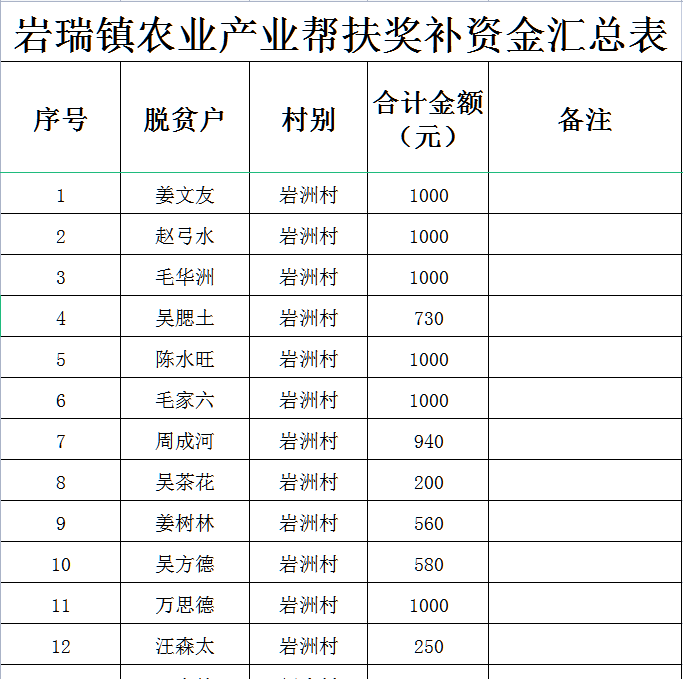 巖瑞鎮農業產業幫扶獎補資金匯總表