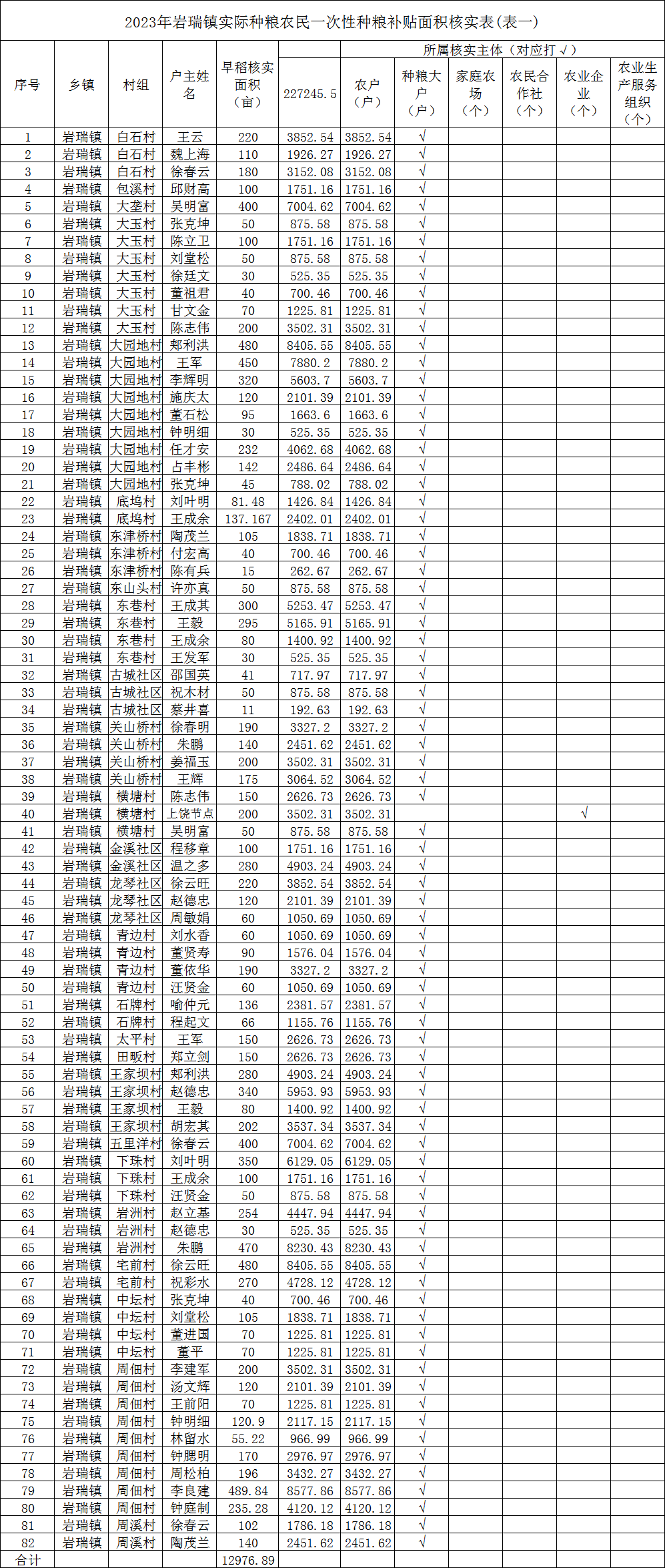 2023年巖瑞鎮(zhèn)實(shí)際種糧農(nóng)民一次性種糧補(bǔ)貼面積