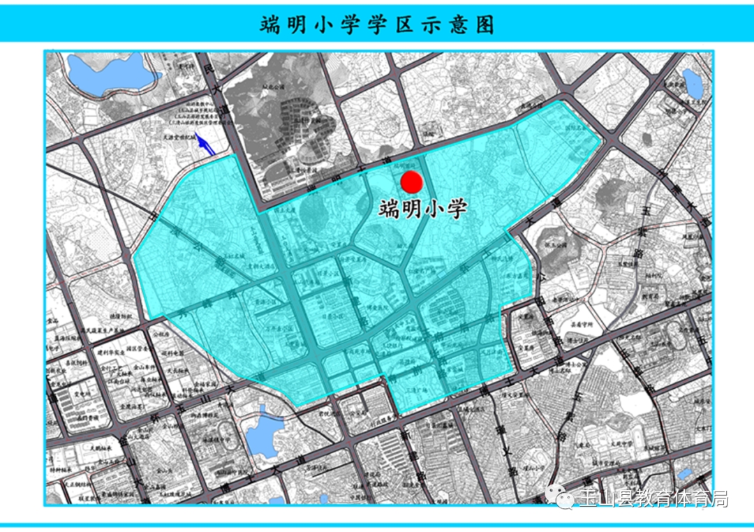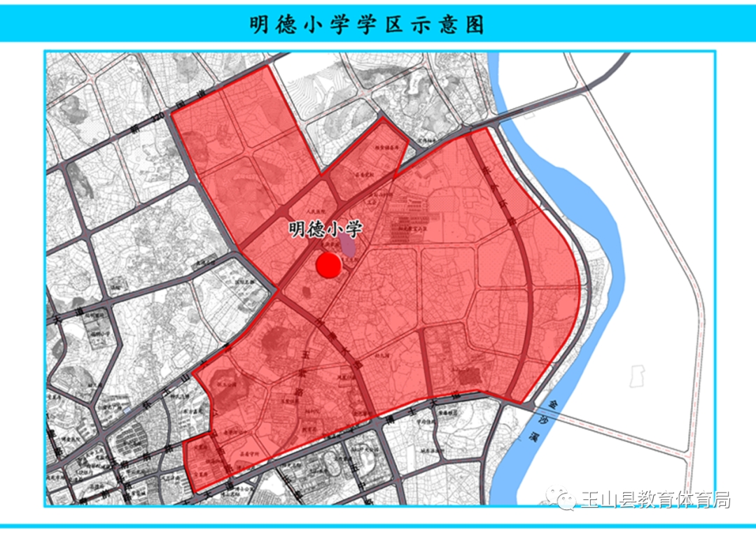 (4)明德小學學區:玉清大道以東——懷玉山大道以南——玉都路以東——芳苑路以南——玉微路以東——博士大道以北所圍區塊為縣明德小學學區。具體區塊為:縣后山、舒家棚、芳草園、陽光聚寶山莊、中駿璟悅、榮盛華景、綜合安置小區(A、B、C區)、電信局安置房、銀海御庭、博士家苑、翡翠國際、鳳凰印象、龍湖豪庭等。