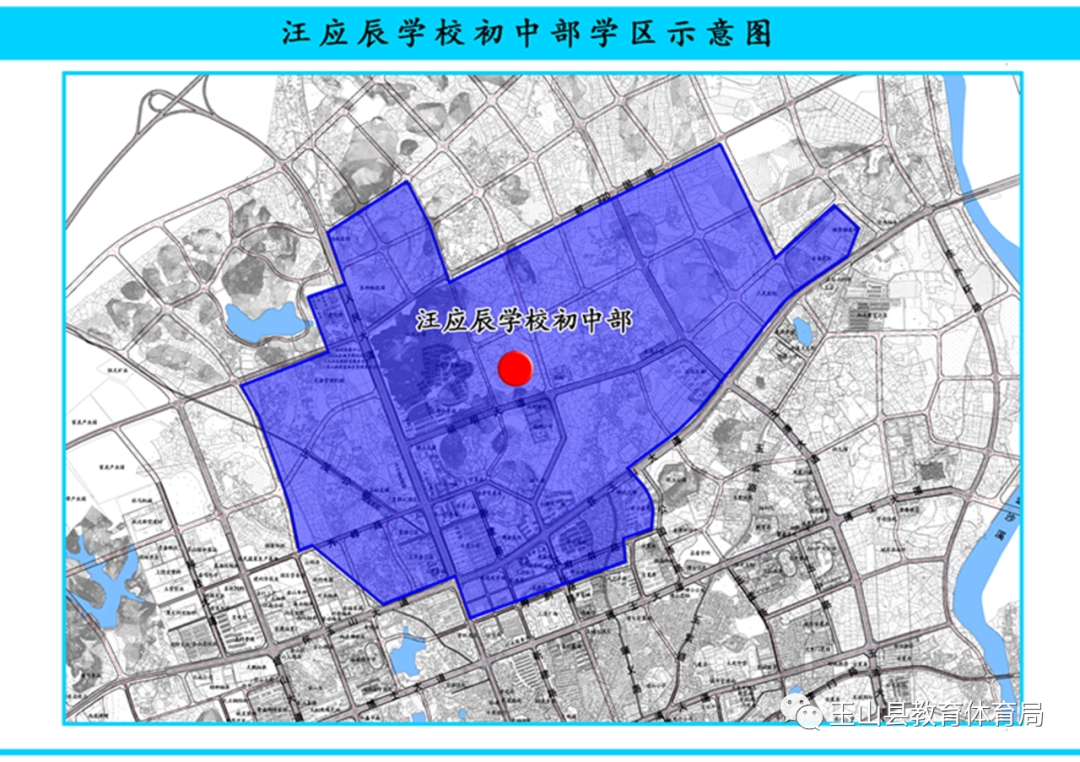(4)汪應辰學校初中部:懷玉山大道東頭為起點——懷玉山大道以北——玉都路以西——芳苑路以北——玉微路以西——府前路以北——人民大道以東——懷玉山大道以北——芳澤路以東——汪應辰北路以東區域為汪應辰學校初中部區域,其主要區塊為:國際名都、中駿璟悅、玉山汽車交易市場、華云龍庭嘉園、東方嘉苑、東方雅居、府前路67號、小徐村、王村坂村、紅寶石廣場、西商苑、日安小區、日景現代城、大中玉府、陽光首府、博晟又一城、潤澤園、博鑫花園、玉皇新城、萬年青小區、貴源小區、錦溪佳苑、下塢亭、富力院士廷、名人花園、端明首府、玉虹翰林院、三清山怡景園、天源堂世紀城、玉虹世紀家園、西排山、周家塘山、東部物流城、洋巖村、楊家尖、鄒家小組、天獅灣等。