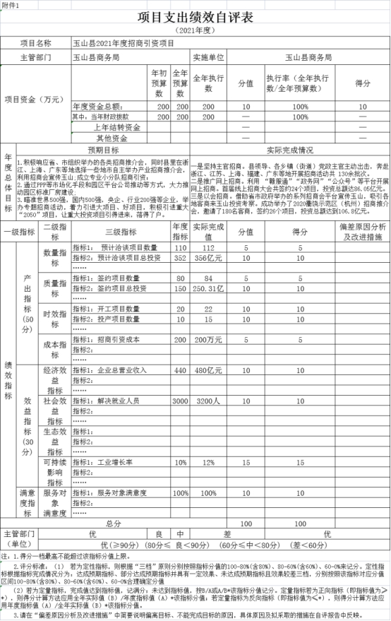 項目績效自評總體綜述:根據年初設定的績效目標,2021年招商引資項目績效自評得分為100分。項目全年預算數為200萬元,執行數為200萬元,完成預算的100%。