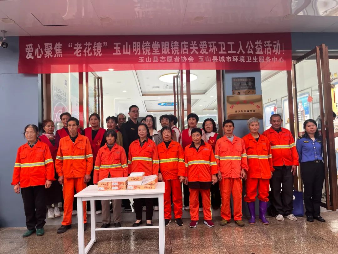 為更好地關心關愛環衛工人,玉山志愿者協會聯合愛心商家明鏡堂眼鏡店,開展了愛心聚焦“老花鏡”為環衛工人送溫暖公益活動,當天220名環衛工人享受了免費驗光及配發眼鏡服務。