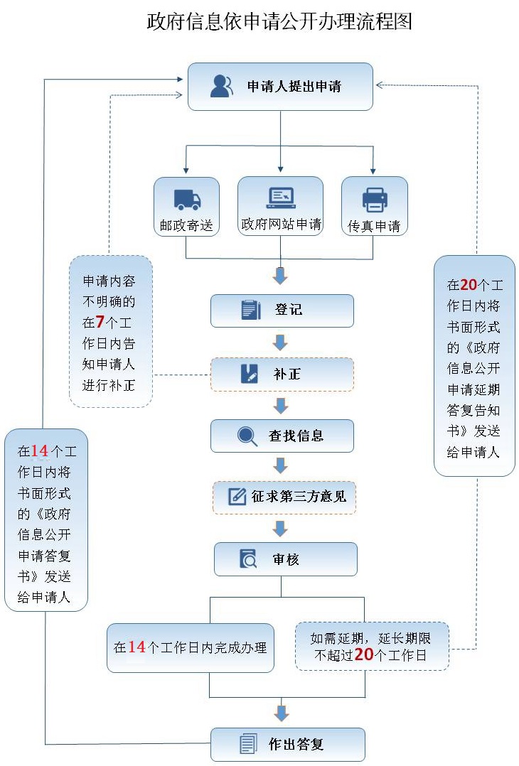 本機關收到政府信息公開申請后,按規定程序對申請進行審查,能夠當場答復的,當場予以答復;不能當場答復的,自收到申請之日起在14個工作日內予以答復;如遇特殊情況需延長答復期限的,經本機關信息公開工作機構負責人同意,并告知申請人,可延長20個工作日。