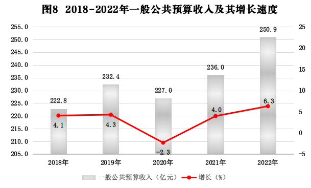 全年全市一般公共預算收入250.9億元,比上年增長6.3%,地方稅收收入168.8億元,增長5.0%,占一般公共預算收入的比重為67.3%。在主體稅種中,增值稅完成78.5億元,增長1.7%,企業所得稅完成13.9億元,增長12.1%;個人所得稅完成4.1億元,增長17.1%;全年一般公共預算支出793.8億元,增長5.4%。在重點支出中,教育支出完成145.9億元,增長5.3%;社會保障和就業支出完成83.2億元,下降2.1%;城鄉社區事務支出完成104.5億元,下降2.1%。