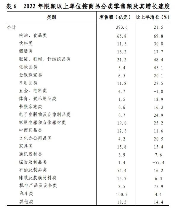 全年全市限額以上批發零售業零售額393.6億元,比上年增長21.5%。其中,糧油、食品類零售額65.8億元,增長69.8%;服裝、鞋帽、針紡織品類零售額21.2億元,增長48.4%;汽車類零售額100.2億元,增長4.1%;家具類零售額15.8億元,增長15.4%;石油及制品類零售額54.4億元,增長16.2%;家用電器和音像器材類零售額19.0億元,增長25.2%;化妝品類零售額5.4億元,增長43.1%;建筑及裝潢材料類零售額15.7億元,增長6.3%。