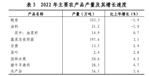 全年全市油料產量21.2萬噸,比上年下降1.0%,其中,油菜籽14.9萬噸,增長0.7%。蔬菜及食用菌產量197.6萬噸,增長3.1%。甘蔗產量13.5萬噸,增長2.4%。茶葉產量2.42萬噸,增長2.8%。園林水果產量20.6萬噸,增長4.2%。
