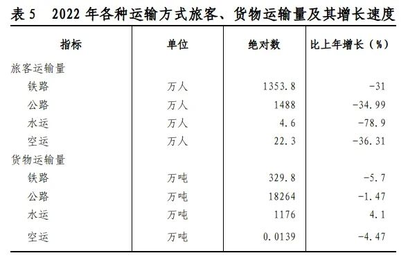 全年全市貨物運輸量19769.8萬噸,旅客運輸量2868.7萬人。全年全市公路、水運貨物運輸周轉量442.0億噸公里,增長3.2%;旅客運輸周轉量71769萬人公里,下降37.3%。