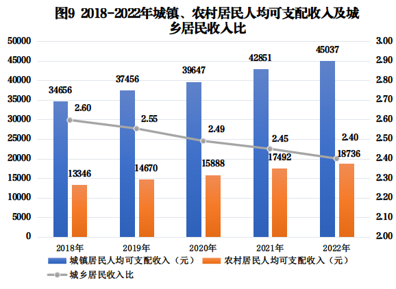 全年全市居民人均可支配收入31675元,比上年增長6.3%。其中,城鎮居民人均可支配收入45037元,增長5.1%;農村居民人均可支配收入18736元,增長7.1%。城鄉居民收入比2.40:1,比上年縮小0.05。