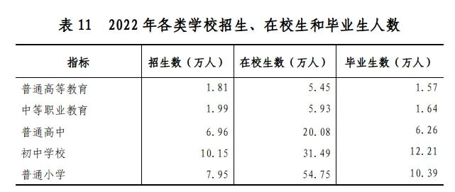 全年全市普通高等教育招生1.81萬人,在校生5.45萬人,畢業生1.57萬人。普通高中招生6.96萬人,在校生20.08萬人,畢業生6.26萬人。中等職業教育招生1.99萬人,在校生5.93萬人,畢業生1.64萬人。初中學校招生10.15萬人,在校生31.49萬人,畢業生12.21萬人。普通小學招生7.95萬人,在校生54.75萬人,畢業生10.39萬人。特殊教育在校生0.62萬人。幼兒園2686所,在園幼兒20.42萬人。各類民辦學校1491所;各類民辦學校在校學生25.83萬人。小學凈入學率101.5%,初中毛入學率108%,高中階段教育毛入學率93.25%,普通高考錄取率86.42%。