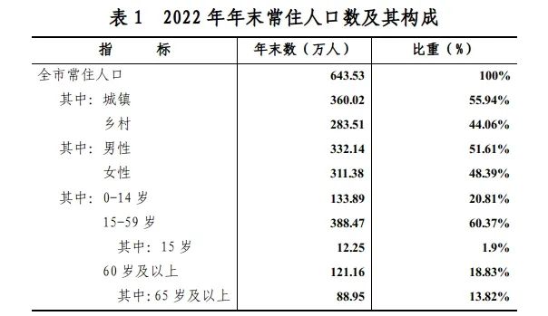 年末全市常住人口643.53萬人,比上年末減少1408人。其中,城鎮常住人口360.02萬人,占總人口的比重(常住人口城鎮化率)為55.94%,比上年末提高0.63個百分點。全年出生人口4.37萬人,出生率6.78‰,比上年下降1.2個千分點;死亡人口4.6萬人,死亡率7.15‰,比上年上漲0.17個千分點;自然增長率-0.37‰,下降1.37個千分點。