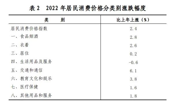 全年全市居民消費價格(CPI)上漲2.4%,商品零售價格上漲5.2%。八大類商品和服務價格“七漲一降”,其中,交通和通信上漲6.1%,教育文化和娛樂上漲3.8%,食品煙酒上漲2.8%,衣著上漲2.6%,其他用品和服務上漲1.8%,醫療保健上漲1.6%,居住上漲0.2%,生活用品和服務下降0.6%。