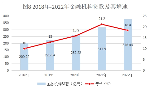 年末,金融機(jī)構(gòu)各項(xiàng)貸款余額達(dá)到376.43億元,比上年增長(zhǎng)18.4%,比年初增加58.53億元。住戶(hù)貸款余額171.37億元,比年初增加18.74億元;非金融機(jī)構(gòu)及機(jī)關(guān)團(tuán)體貸款余額205.06億元,比年初增加39.79億元。