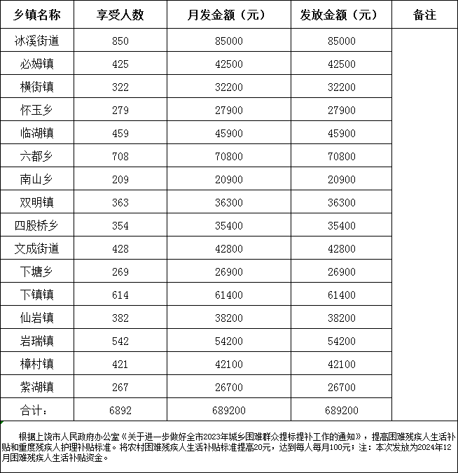 2024年12月份困難殘疾人生活補貼明細表
